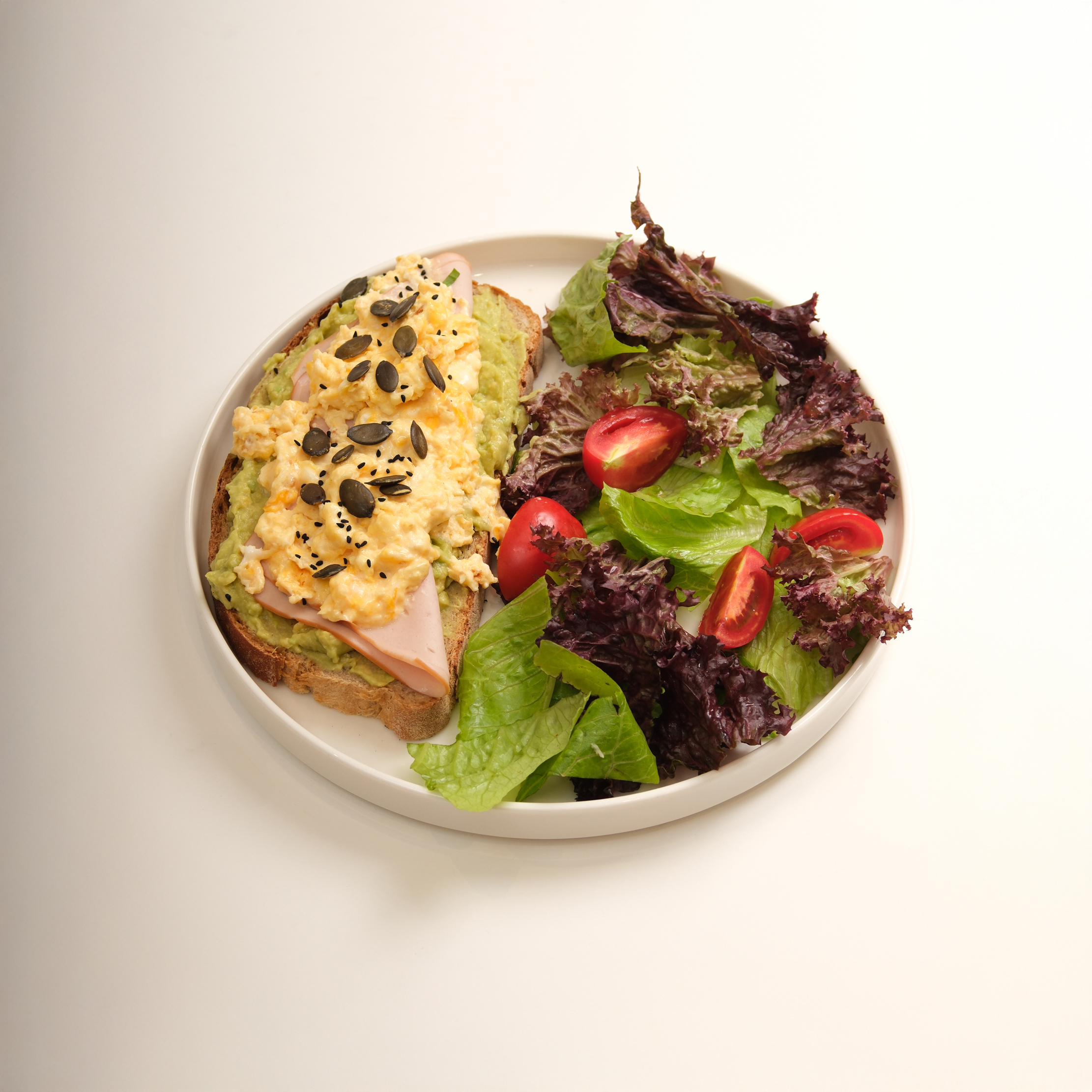 Ekşi maya ekmek üzeri avokado püresi, hindi füme, scramble yumurta