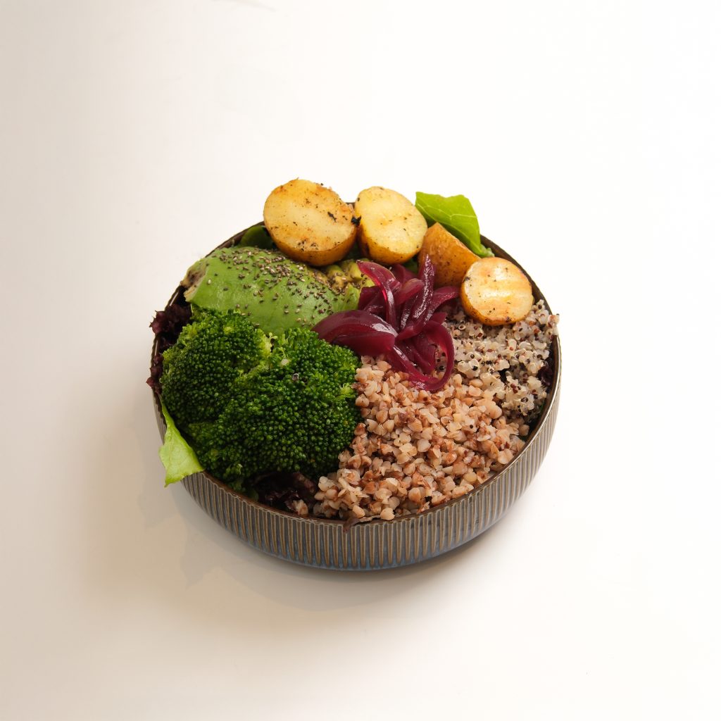 Marul, Brokoli, Avakado, Baby Patates, Kinoa, Karabuğday, Kırmızı Soğan Turşusu, Chia Tohumu
