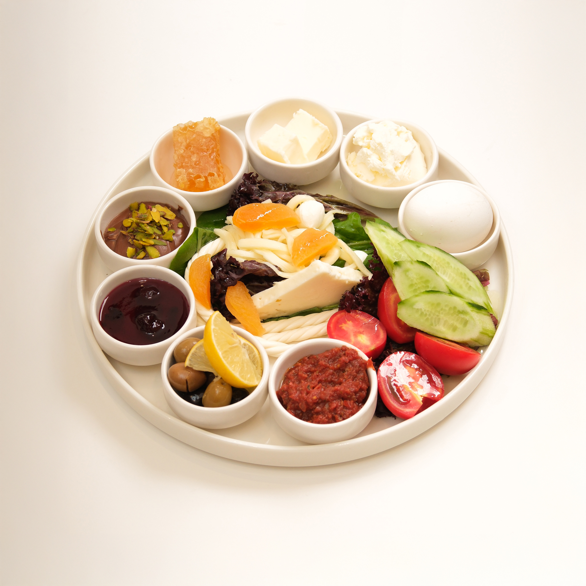 Yeşil ve siyah zeytin, reçel, bal, tereyağ, domates, salatalık, haşlanmış yumurta, beyaz peynir, çeçil ve burgu peynir, kaymak, acuka, ekmek