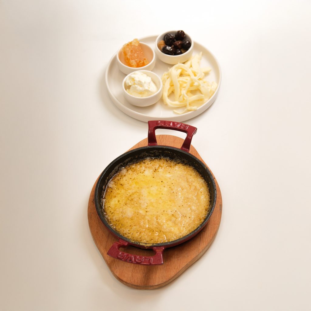 Kuymak, çeçil peyniri, siyah ve yeşil zeytin, bal, kaymak