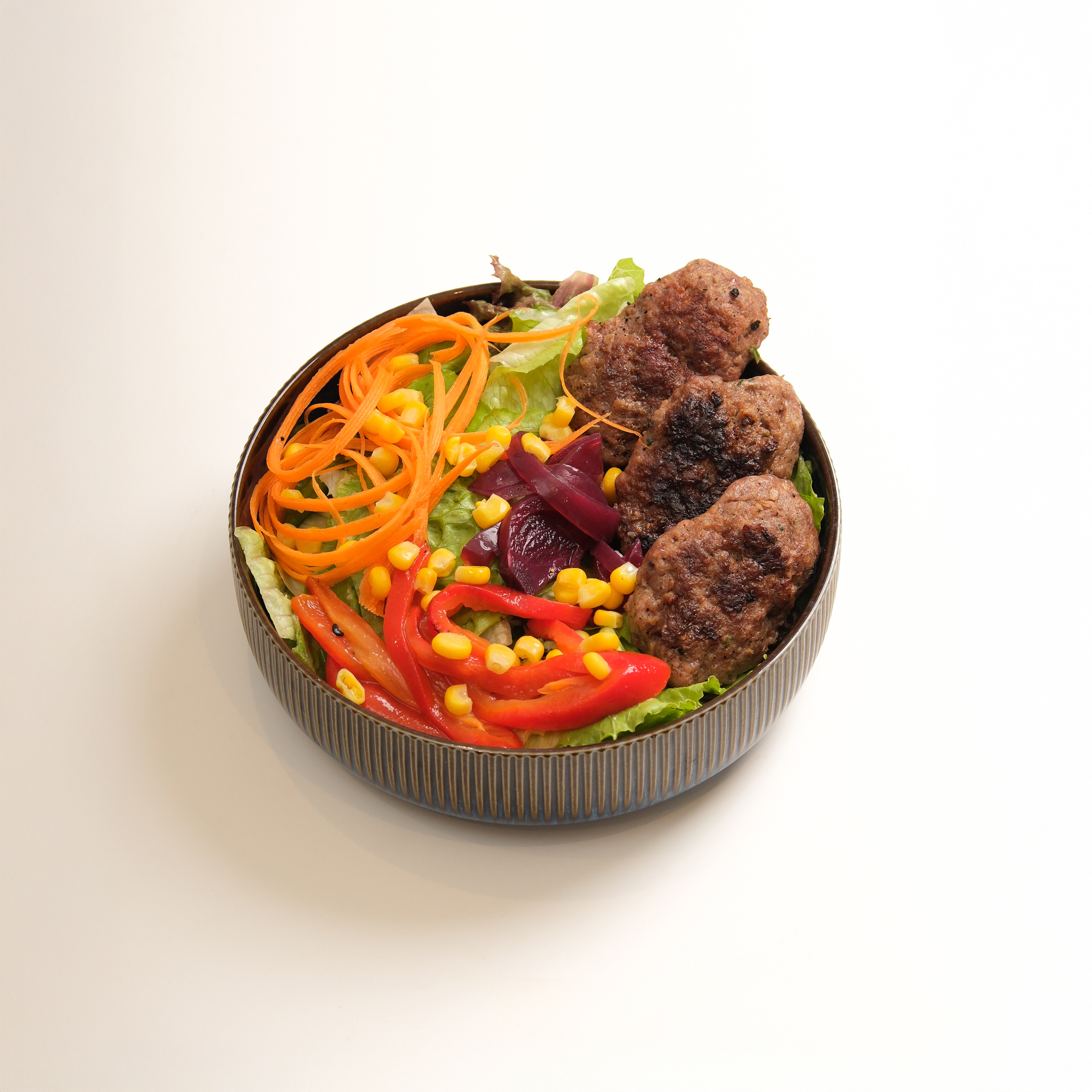 Köfte, Marul, Mısır, Havuç, Köz Kapya, Kırmızı Soğan Turşusu