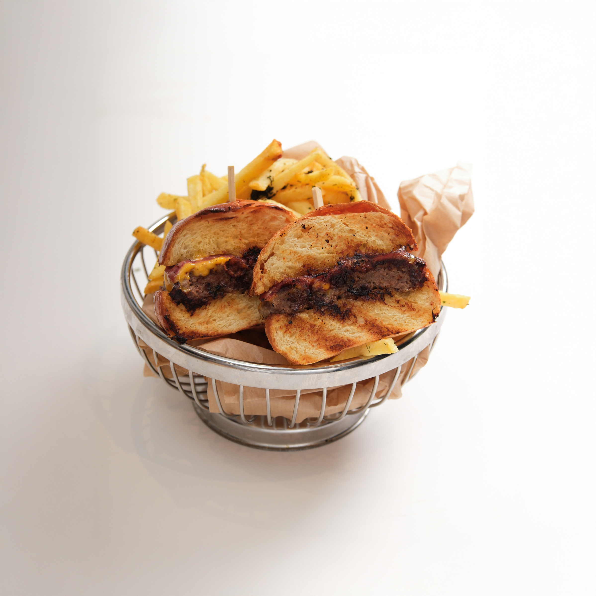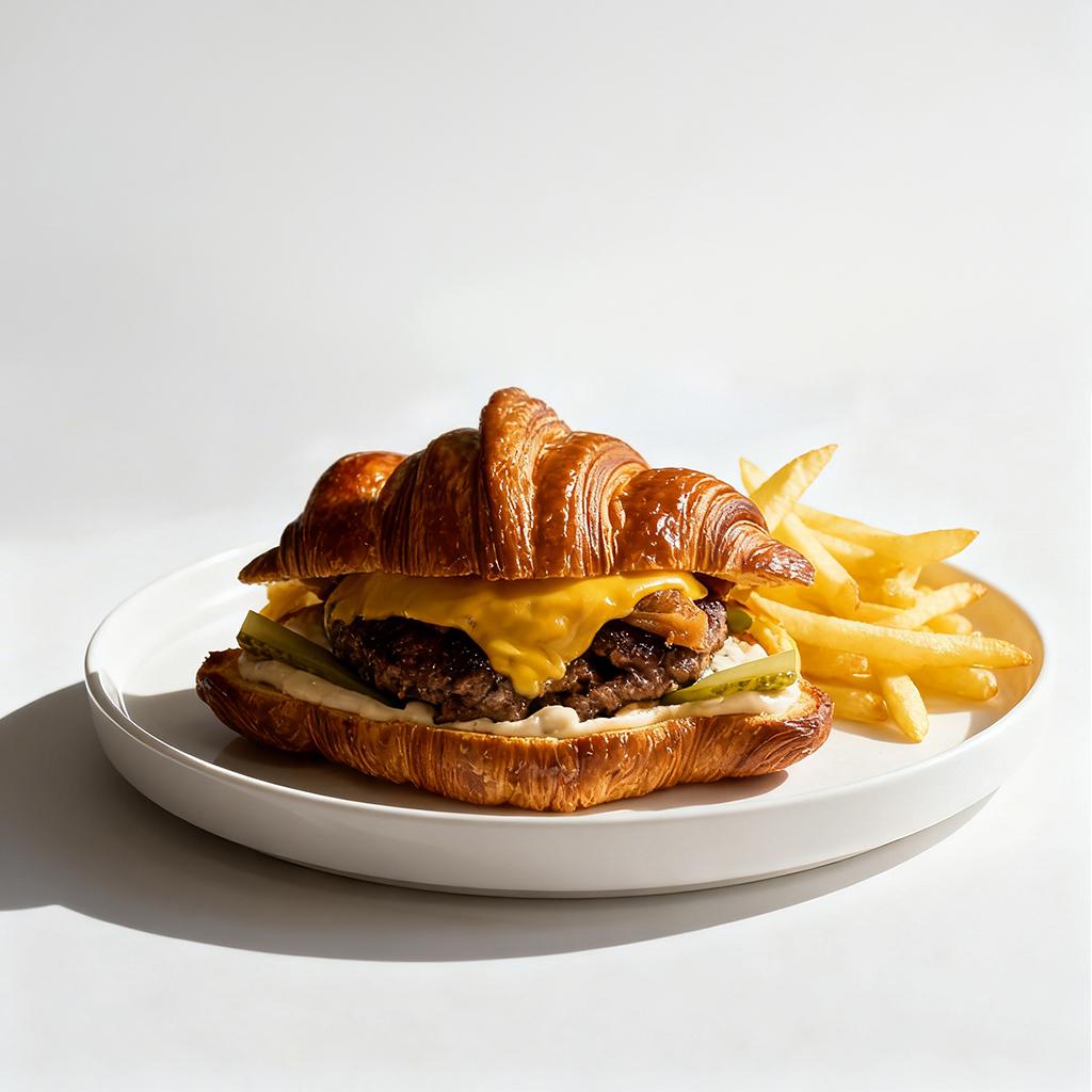 Tereyağlı Kuruvasan, Moys Sos, Karamelize Soğan, Cheddar Peyniri, Özel Moys Sos, Patates.