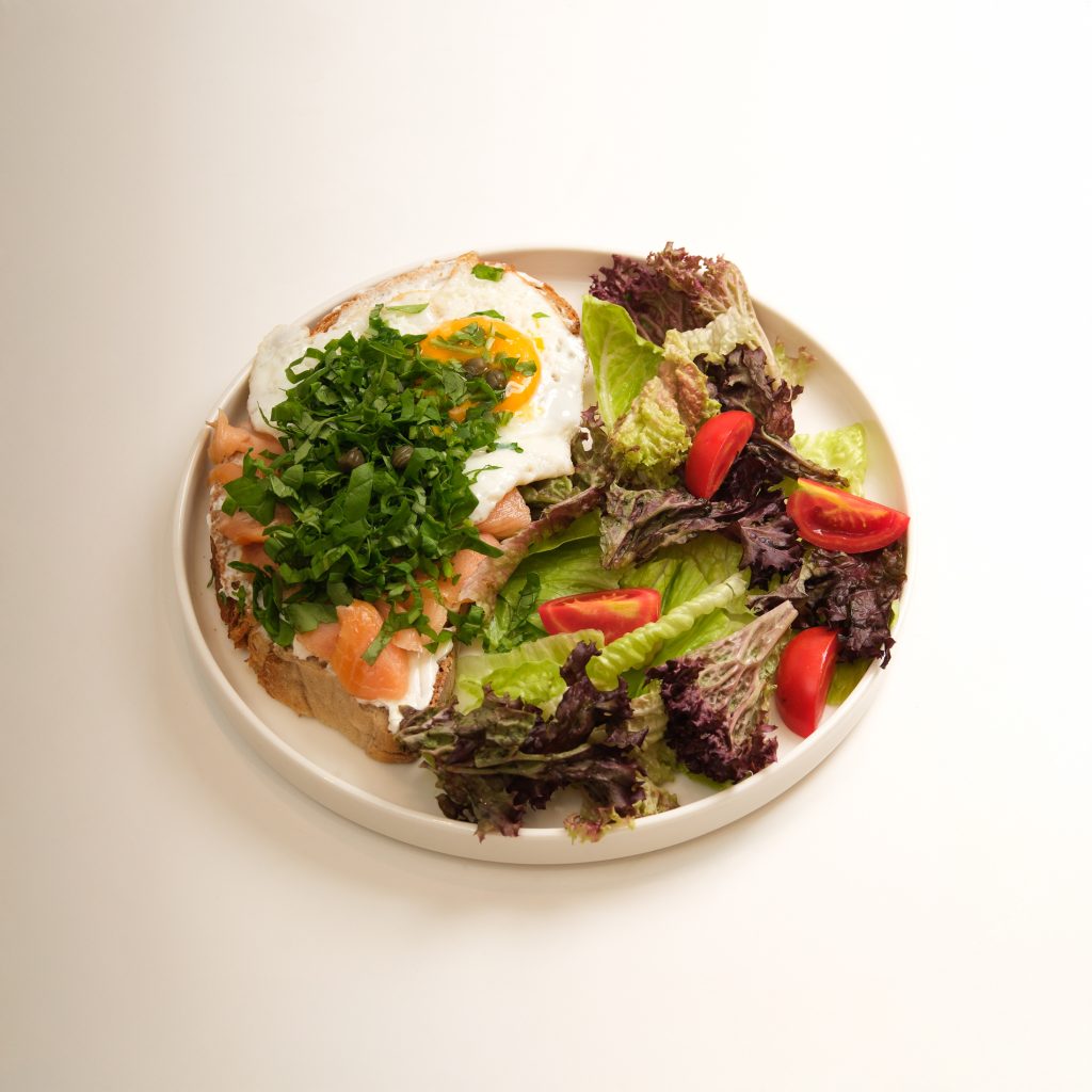 Ekşi maya ekmek üzeri krem peynir, füme somon, göz yumurta