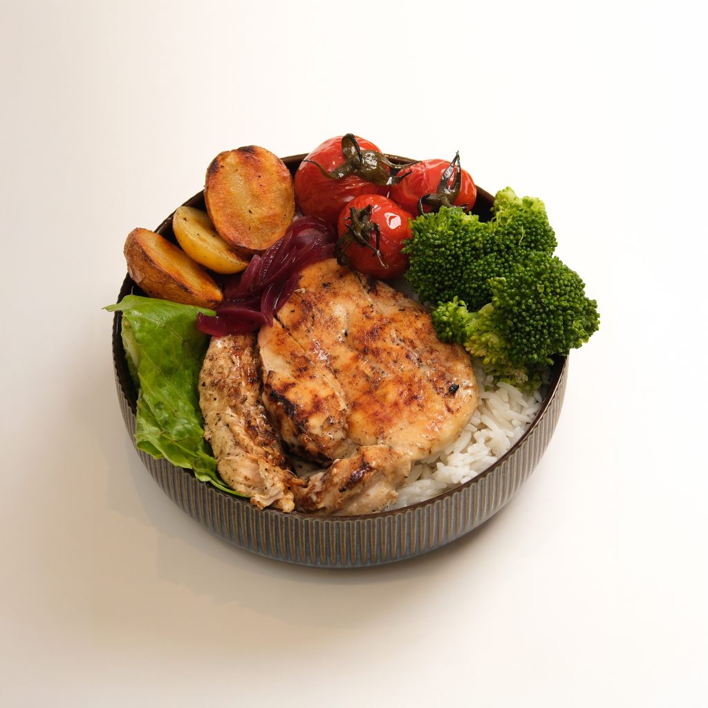 Tavuk göğüs, Basmati, Marul, Brokoli, Baby Patates, Soğan Turşusu, Confit, Cherry Domates