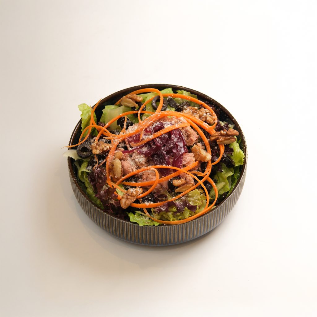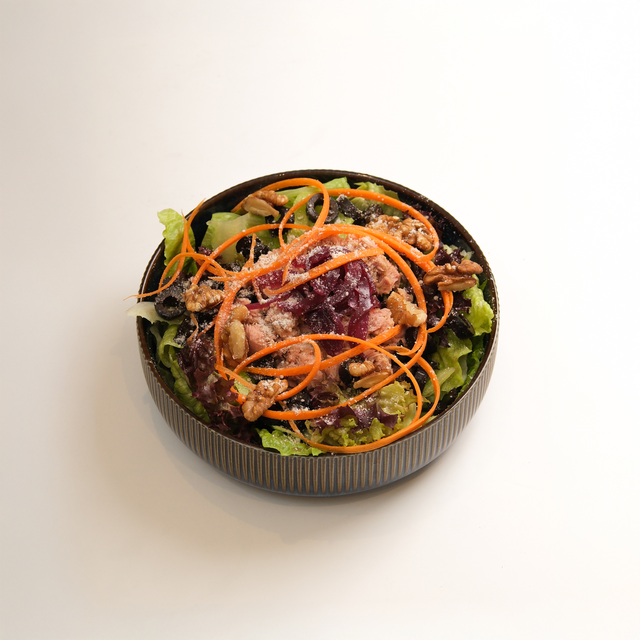 Ton Balığı, Havuç, Mısır, Marul, Kırmızı Soğan Turşusu, Siyah Zeytin, Ceviz, Parmesan