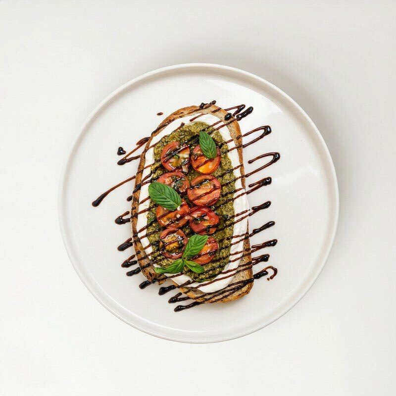 Ekşi maya ekmek üzeri krem peyner,pesto sos, fırınlanmış fesleğenli cherry domates, balzamik glaze.